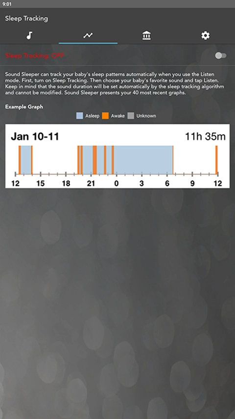 4.在“睡眠追踪模式”下,软件将自动生成睡眠图表,记录宝宝或用户的睡眠状况,助力家长分析睡眠质量,并逐步调整作息安排。