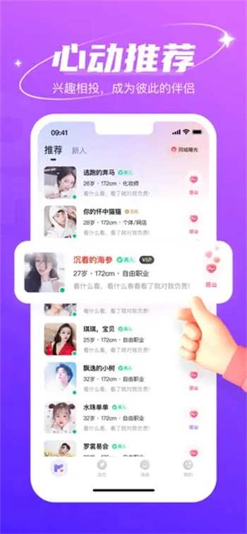 1. 系统会依据用户的性格、兴趣、爱好等多方面特征进行智能推荐,帮助用户找到志同道合的朋友进行互动聊天、结交朋友,最终发展为彼此的伴侣,逐步培养出深厚的感情。