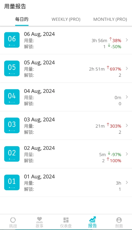 5、全面的用量报告,涵盖用户使用时长、解锁次数等内容,数据变化呈现得十分清晰。