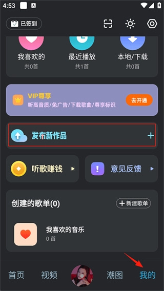 1、打开dj音乐库,登录账号后点击“我的”进入个人中心页面,在页面中找到“发布新作品”或者功能相似的按钮。