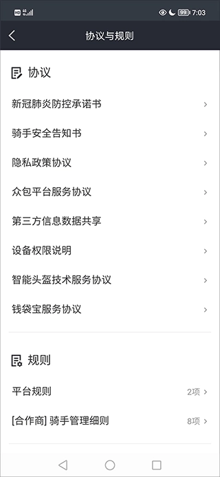 3、然后在协议与规则板块里找到并点击“【合作商】骑手管理细则”;