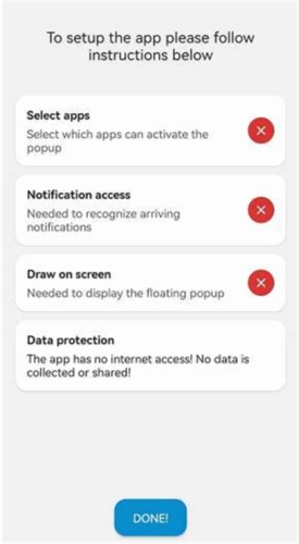 2、第二步:进入应用后,软件会依据我们的实际情况获取三个权限(下图中打X的表示功能权限未开启)。