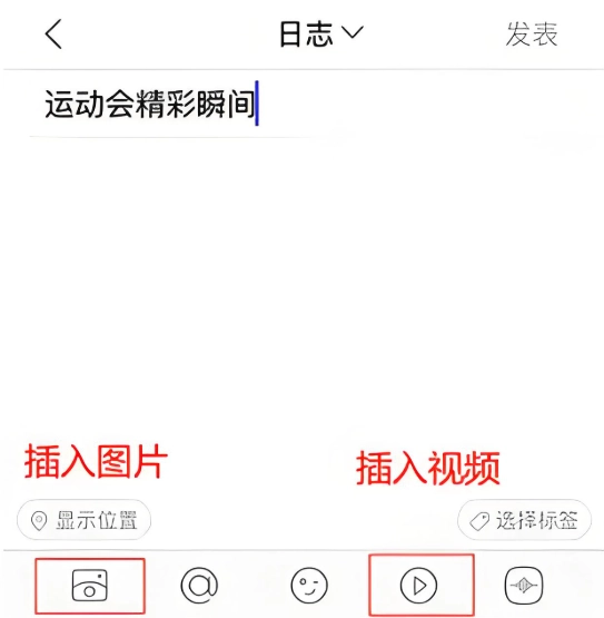 4、编辑日志内容,挑选好要上传的图片或视频后,点击【发表】按钮就能完成操作。