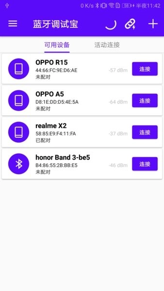 蓝牙调试宝具备多种搜索结果过滤条件,包括设备名称、MAC地址、信号强度以及是否已收藏等。它还支持多设备同时连接、循环搜索设置和自动确认UUID。搜索到的设备信息(如信号强度、MAC地址、配对状态等)会实时显示,方便用户直观查看。另外,该应用也提供扫描含设备MAC地址的二维码以实现快速连接的功能。