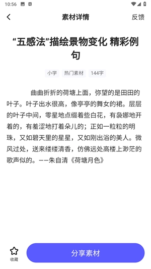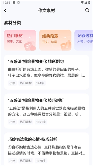 2、点击热门素材后,你会看到丰富的作文素材。