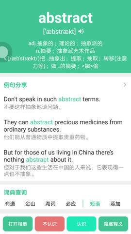 可以按顺序背诵、随机背诵或按字母顺序背诵,还能把单词加入生词本进行重点记忆;单词通过短语搭配加例句的场景化记忆法,帮助您更深刻地记住单词,减少遗忘。