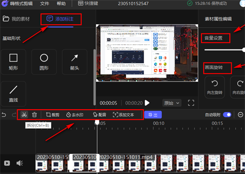 5、第五步,把视频素材添加到轨道后,我们可以从拆分、裁剪、去水印、配音、添加文本、添加标注、画面旋转、音量调节等工具里,挑选自己需要的来完成视频剪辑,最后将剪辑好的视频导出就可以了。