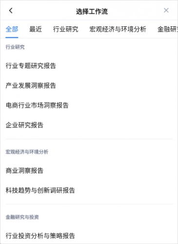 2、AI秘塔AI会梳理出详尽的内容摘要,同时标注权威信息来源,助力你迅速把握关键信息。3、借助AI功能可以便捷生成大纲、思维导图以及演示所需的PPT,有效提高工作效率。4、所有生成的内容都支持导出操作,能轻松转换为WORD或PDF格式,便于保存与分享。二、工作流1、不管是开展行业调研还是进行报告撰写,秘塔AI涵盖7大类别、25个工作场景,可满足行业分析、经济研判、投资建议以及运营规划等多方面需求: