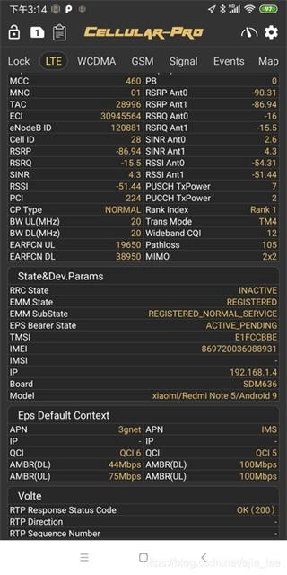- 呈现当前物理层与RRC层的部分参数,像小区(ECI)、带宽、频点、信号(RSRP)这类关键信息都包含在内。