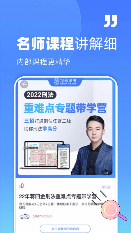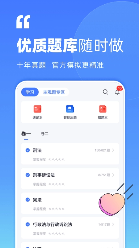 觉晓法考是一款专门为法律职业资格考试设计的备考工具,它提供了全面且系统的复习规划。平台拥有丰富的真题题库,这些题目按照知识点进行了细致的分类,再加上智能练习系统,能够精准找出考生的薄弱环节;学习数据会实时更新统计,涵盖了听课进度、刷题量等重要指标,助力考生清楚地把握复习节奏;高清视频课程讲解得十分深入,能有效攻克疑难知识点。这款工具可以明显提高备考效率,有需要的用户不妨直接体验一下。