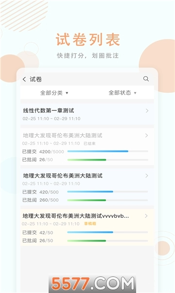 教师可随时随地通过移动设备进行批阅,借助面板快速打分,支持划圈批注与语音点评功能。