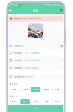 4、产品信息成功保存后,即可设置相应的提醒时间与提醒方式。