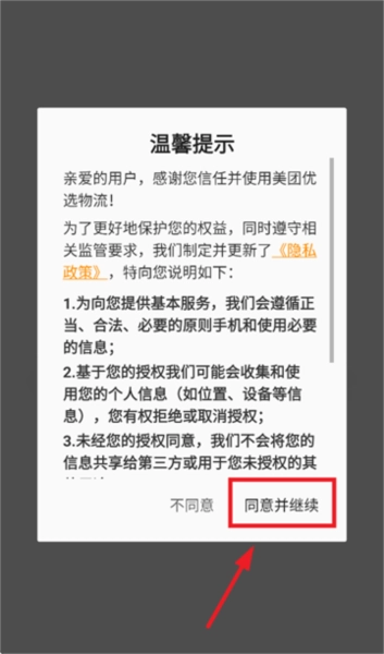并打开美团优选物流,在温馨提示界面点击同意并继续