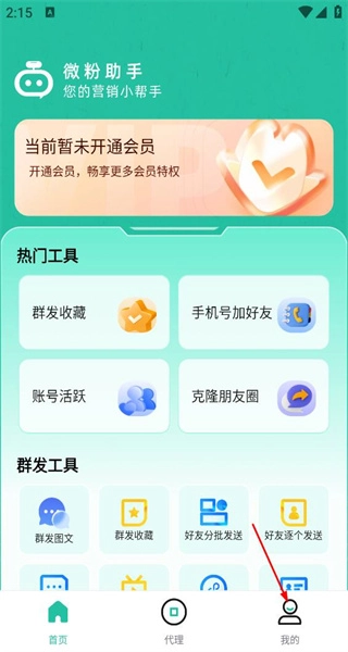 1、启动微粉助手软件,进入主界面后,能使用群发等常用工具,点击底部的“我的”选项,即可进入个人相关页面。