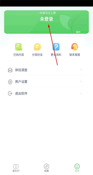1、启动软件后,进入首页界面,找到语文学习相关功能模块,点击底部的“我的”选项,进入个人页面。