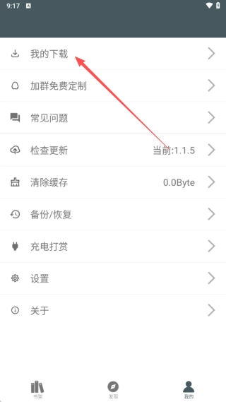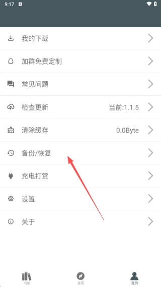 3、回到“我的”界面,找到并点击“备份/恢复”选项,操作示意如图。
