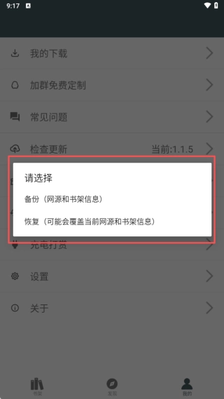 4、在此处,用户能够对网源与书架信息进行备份,避免因误删而无法找到小说,下次可直接点击恢复。