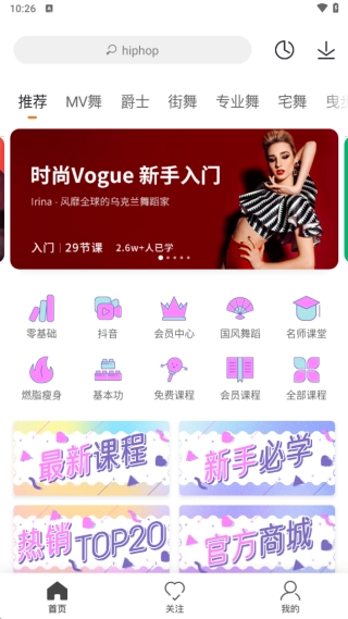 3、打开软件进入首页后,能看到推荐、MV舞、爵士、街舞、专业舞等不同分类,各个阶段的用户都能通过观看这些内容进行学习。