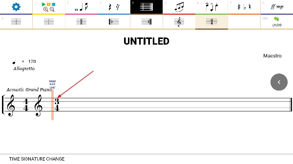 4、点击顶部功能栏中与拍号相关的选项,在乐谱的对应位置添加新拍号,就能完成【TIME-SIGNATURE-CHANGE】的拍号变更操作。