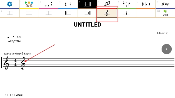 3、点击顶部功能栏里的【谱号切换】按钮,能够在乐谱编辑区域添加新的谱号(例如高音谱号),从而完成【CLEF-CHANGE】操作。