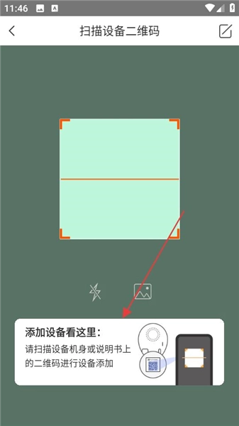 2、进入扫描设备二维码的页面,按照提示,扫描设备机身或者说明书上的二维码,根据指引完成设备信息的录入和配对。