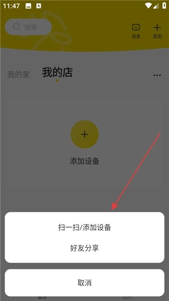 3、要是在我的店铺里添加设备,点击“添加设备”后选择“扫一扫添加设备”,重复扫码的步骤就行;也可以通过好友分享来添加,这样就能完成设备接入,实现远程监控了。