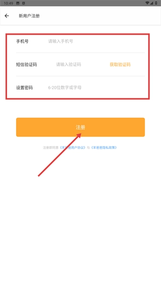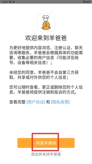 1、仔细阅读【羊爸爸】的服务说明后,点击【同意并继续】按钮,确认接受相关条款即可进入应用。