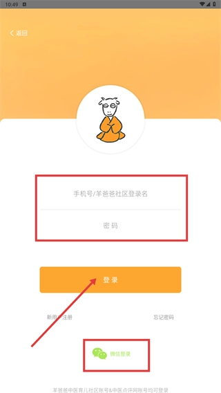 2、在登录界面,可输入【号/羊爸爸社区登录名】和密码后点击【登录】,也能选择【微信登录】进行快捷登录。