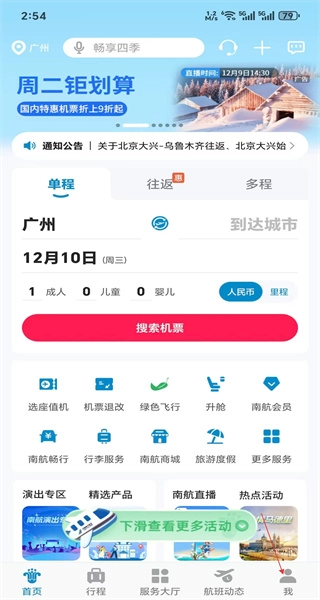 1、打开南方航空软件后,看到机票搜索等功能,点击底部“我的”进入个人中心页面。