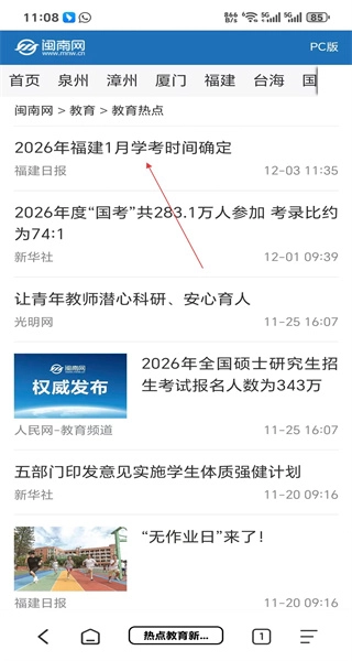 2、进入热点教育新闻页面后,浏览多条资讯的标题,挑选出想要查看的目标资讯,点击该资讯标题就能进入其详细内容页面。