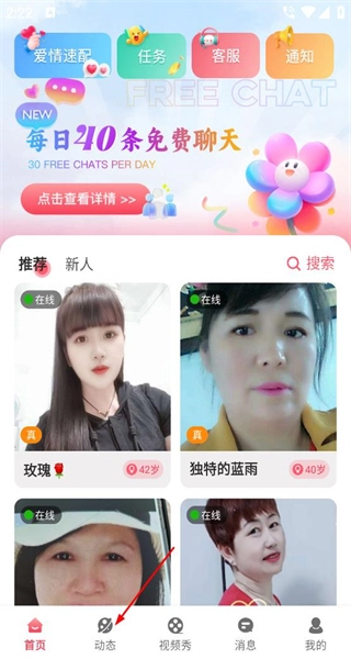 进入软件首页后,能看到推荐的新人列表以及各类功能的入口,点击底部对应的按钮就可以进入动态页面。