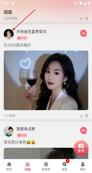 2、进入动态页面后,用户发布的动态内容清晰可见,点击即可查看动态详情,页面底部设有发布等功能按钮。