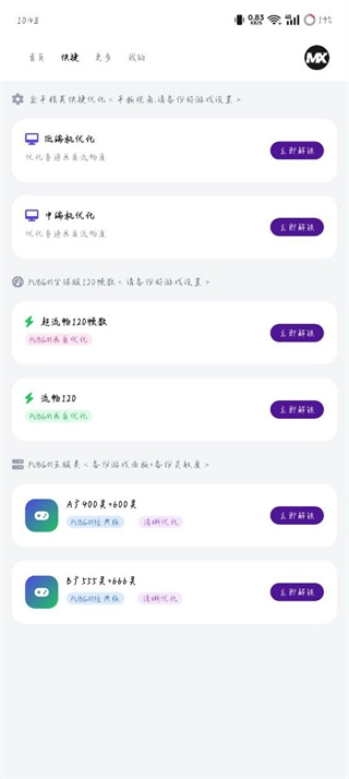 《画质mxpro无任务模式》是一款为玩家打造的画质与性能优化工具,核心功能在于提升游戏的视觉呈现与操作流畅度——通过调整画面参数、解锁高帧率及视角自定义等设置,让游戏画面更清晰顺滑;同时它摒弃了繁杂的任务机制,只需完成基础设置就能一键启动,还搭载了安全防护技术,适配多种设备型号与系统版本,十分适合热爱游戏的用户使用。
