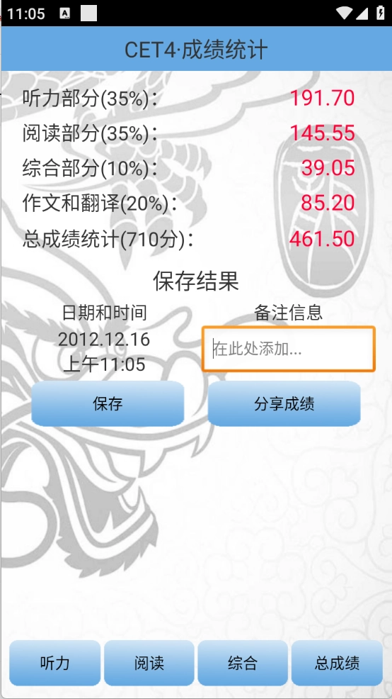 四六级算分器是专为大学四六级考试设计的估分工具,涵盖听力、阅读和综合等模块,支持估分结果的保存与分享,所有功能均可免费使用,能帮助考生大致掌握自身的分数状况。