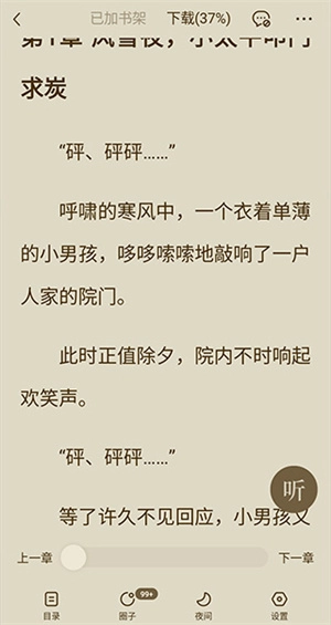 1、当我们选定想收听的小说后,进入小说阅读界面,点击小说中间区域(大概是下方红框所在的位置),就能弹出菜单。