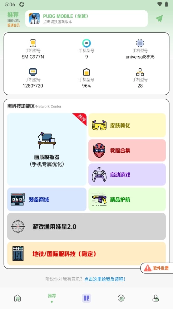 画质鸭是一款功能强大的画质修改软件,适用于《和平精英》《香肠派对》等射击类游戏。软件设有黑科技功能区,涵盖画质模拟器、皮肤美化、教程合集、启动等功能。