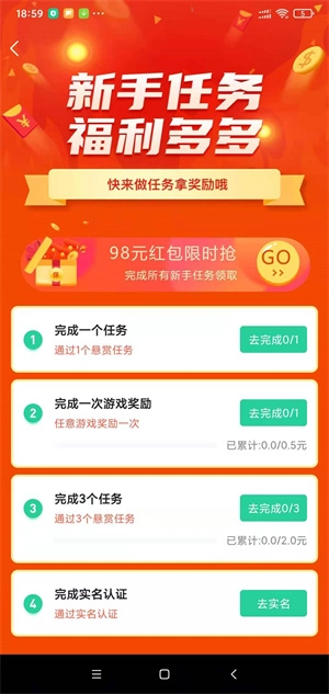 1、新用户注册并完成兼蛋任务即可领取0.3元以上红包,完成所有新手任务最高可获得98元现金奖励
