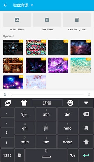 1、支持个性化设置键盘音效、键盘布局样式,还能自定义设置键盘背景。