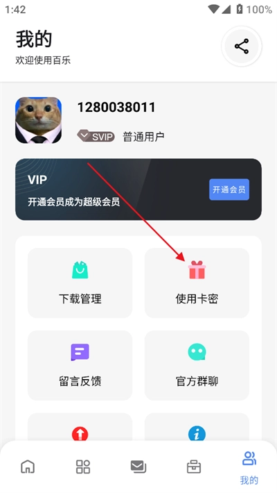 3.完成购买后,获取卡密并记住,接着返回个人中心,点击【使用卡密】按钮。