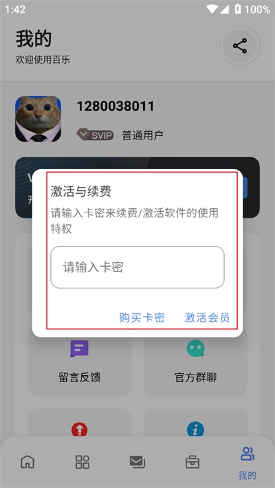 4.打开【激活与续费】弹窗,输入卡密后点击【激活会员】按钮完成操作。