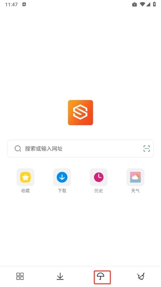 1、首先打开隐身浏览器软件,进入首页后点击下方的【雨伞图标】;