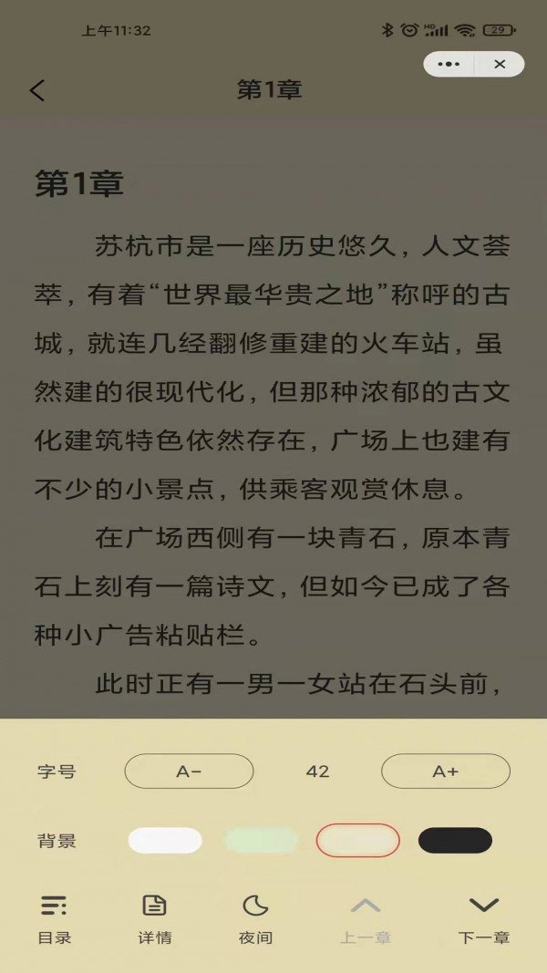3、阅读界面采用贴心设计,配备夜间模式、自动翻页等实用功能,还能自定义背景颜色与字体大小,可满足不同场景下的阅读需求。