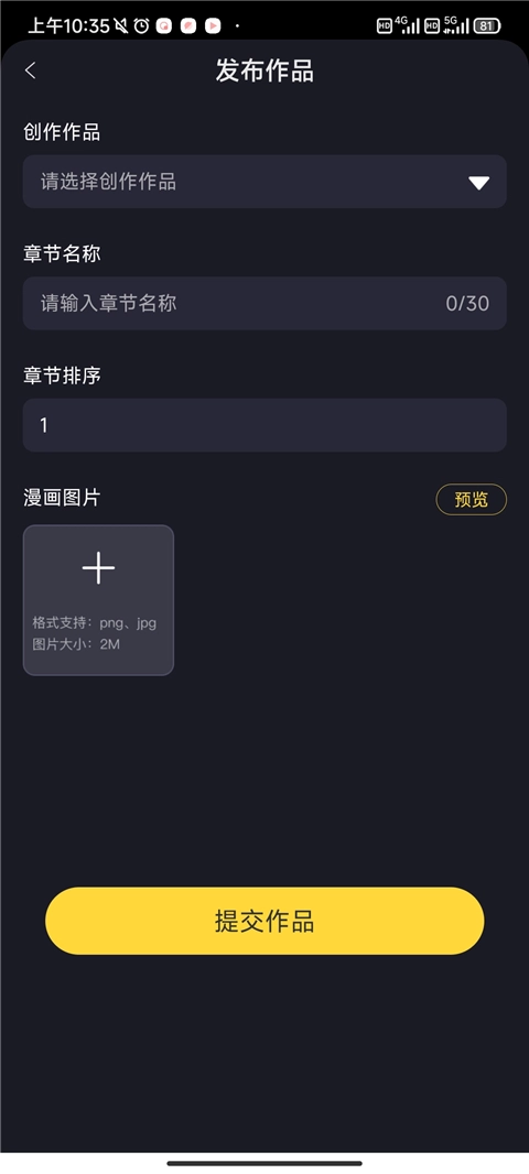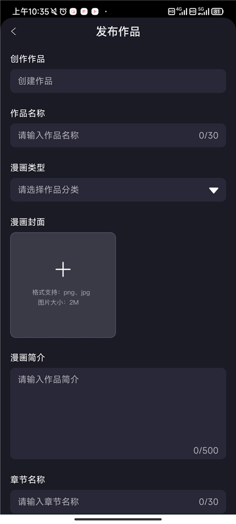 3、录入作品名称、漫画类型、漫画封面、简介等相关信息。