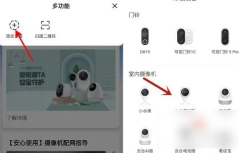 先接通摄像机的电源,接着打开360智能摄像机应用,然后点击界面右上角的+号,再点击添加设备选项,最后选择对应的摄像头类型。