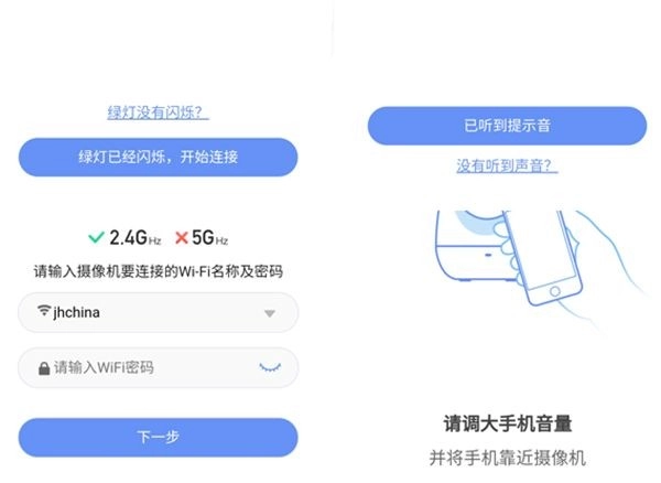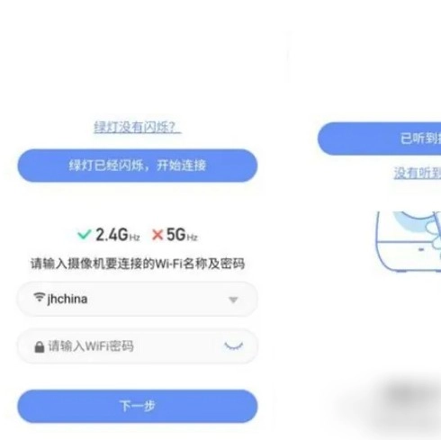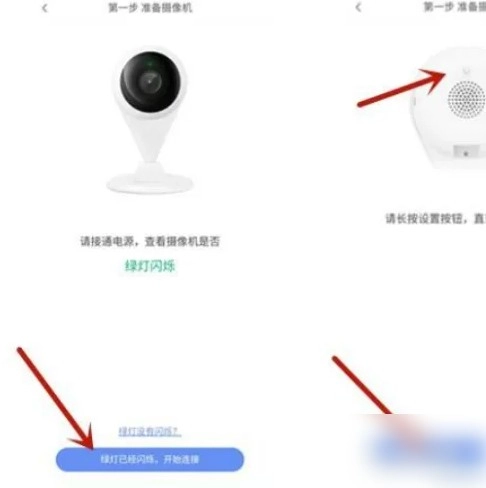 先确认摄像机的绿灯是否亮起,接着点击开启连接,然后长按设置按钮,直至听到声音,最后点击“已听到提示音”。