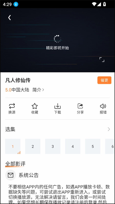 4、点击任意影片就能开始播放。另外,界面里还设有换源、收藏、缓存、分享、反馈等功能按钮,既贴心又实用。
