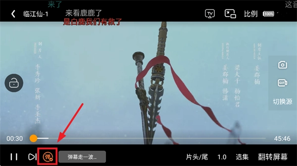 进入全屏界面后点击弹字按钮