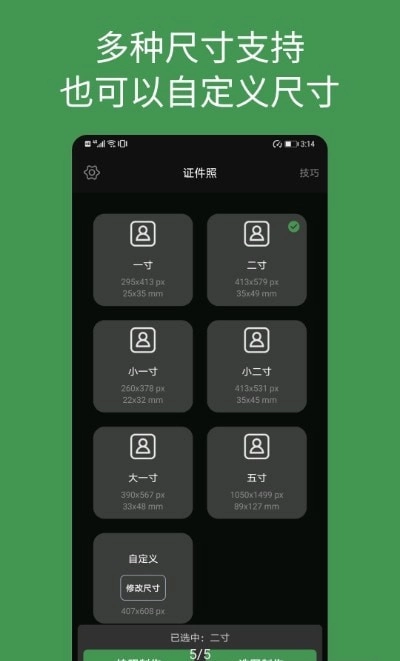 支持多种标准尺寸证件照的制作,同时也提供自定义尺寸证件照的制作服务。