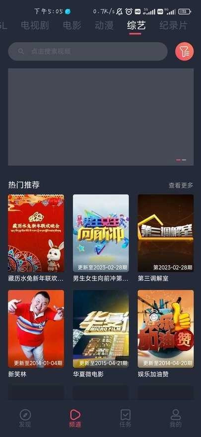 1、找到底部栏的“频道”选项,在其上方的搜索框内输入自己想观看的剧集、电影或综艺的名称,然后点击键盘上的“完成”按钮。