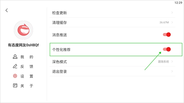 3、在打开的新页面里,点击左侧工具栏上的【设置】选项,接着在右侧新显示的页面中把【个性化推荐】功能开启,如此系统就会依据用户的偏好来推送内容。